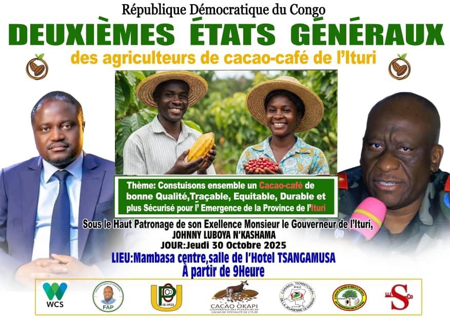 La province de l’Ituri se positionne comme un acteur majeur dans la filière cacao-café. Le jeudi 30 octobre 2025, Mambasa-centre accueillera les Deuxièmes États Généraux des agriculteurs de cacao-café de l’Ituri. Cet événement crucial, placé sous le Haut Patronage de son Excellence Monsieur le Gouverneur de l’Ituri, Johnny Luboya N’Kashama, se tiendra à la salle de l’Hôtel TSANGAMUSA à partir de 9 heures.